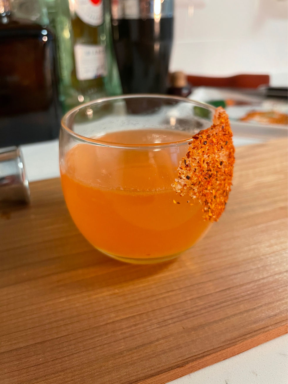 Garnish: wet side of glass with lacto-peach fermented puree, drag over Sel Gris Salt and Tajín.